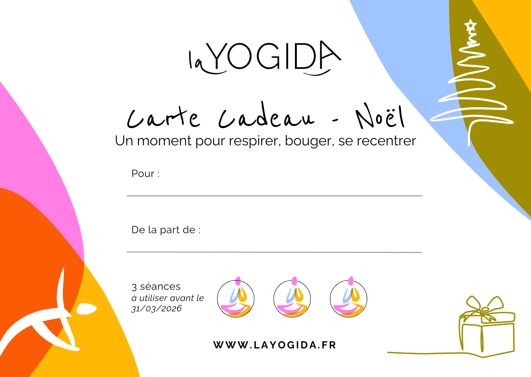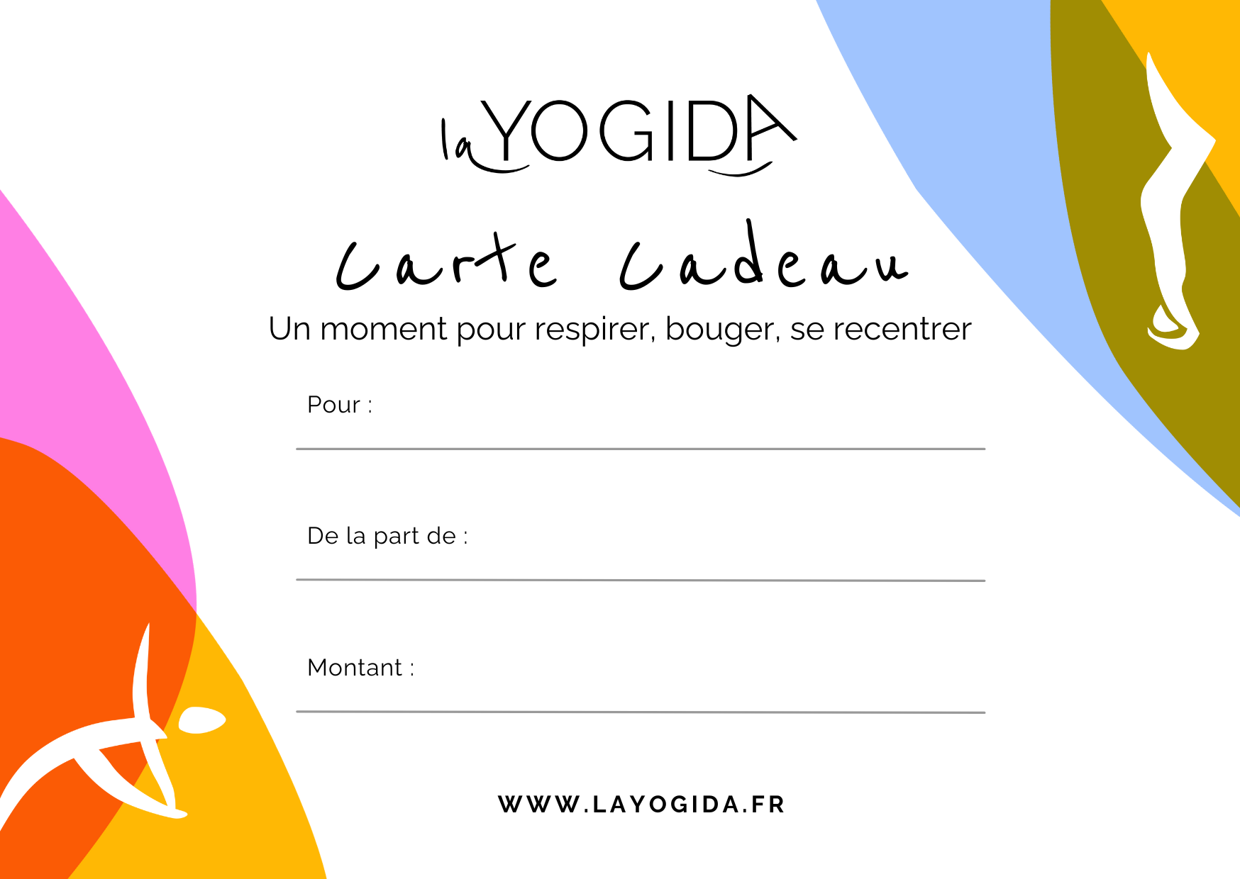 La carte cadeau donne accès aux cours collectifs, privés, événements et ateliers de yoga dispensés par La Yogida.